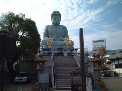 現在のは二代目。街中で建物に囲まれて窮屈そうに座ってはる。国道側から見ると、建物と木の間からちょこんと顔が見えている。ずいぶん前から排気ガス吸わされてかわいそうやな・・・と思っていた。